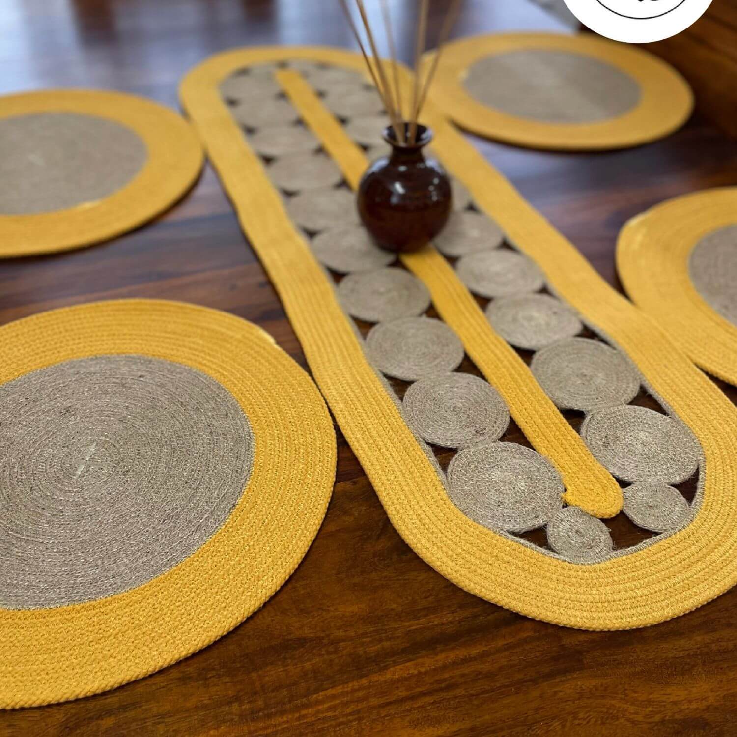 The round table mats are handcrafted from sustainable cotton rope, featuring a customizable concentric circular pattern. Options include a vibrant outer ring with a natural beige inner circle, offering a subtle contrast.