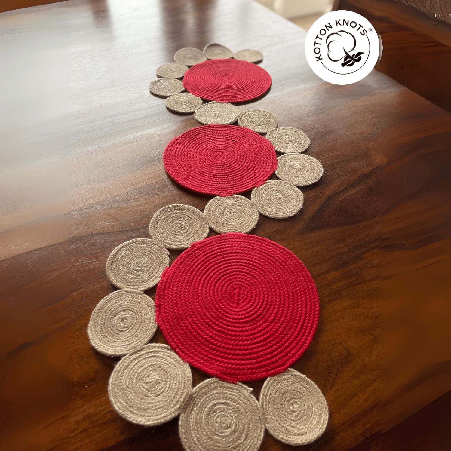The intricate design includes circular patterns arranged in a double line, creating a rhythmic, rustic elegance. These versatile runners add a warm, natural touch to any dining setting.